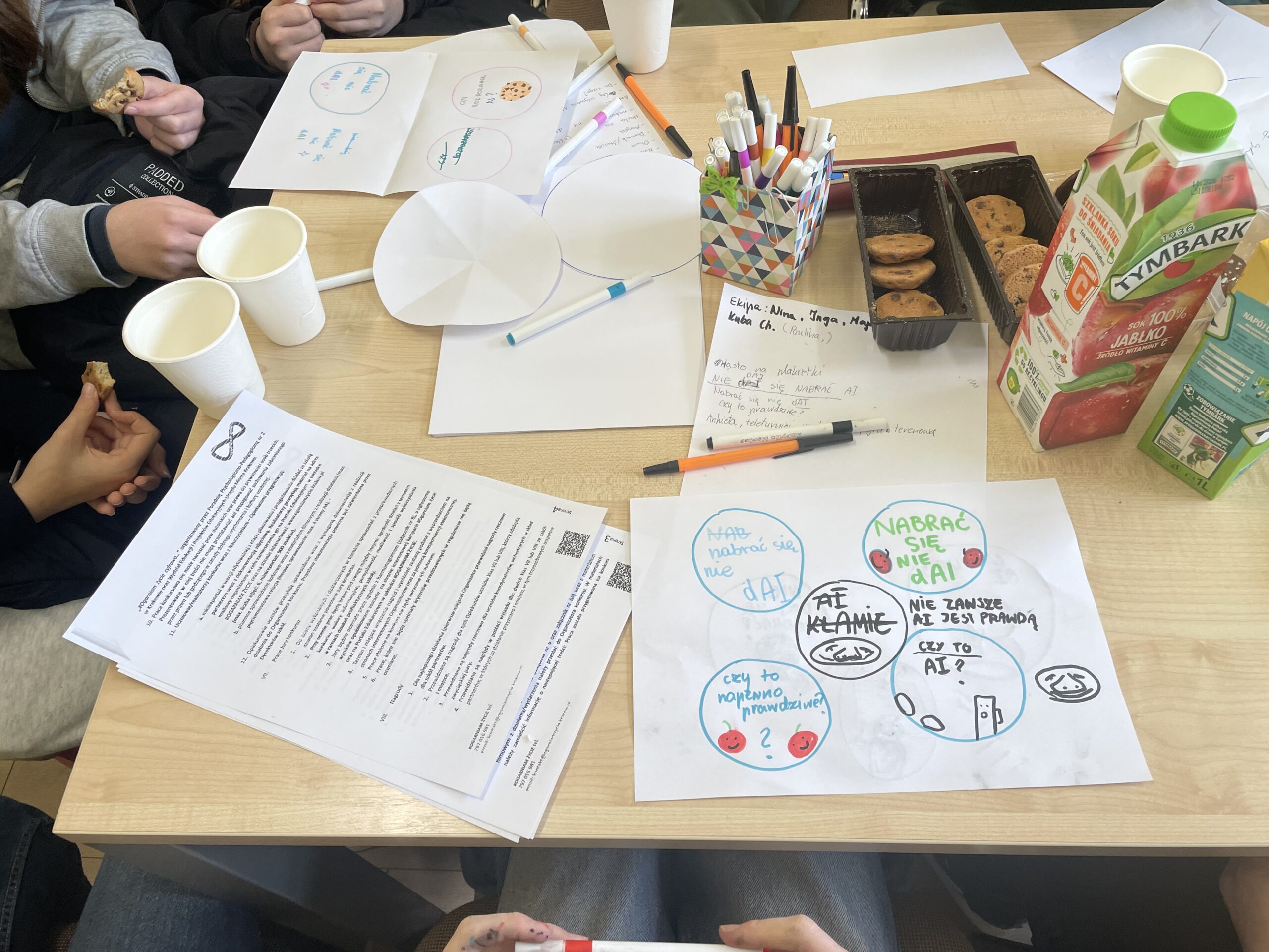 Podczas działań programu #OgarniamŻycie.Cyfrowo nie zabrakło również przekazywania dużych dawek wiedzy. We współpracy ze szkołą partnerską nr. 95 dnia 12.03.2026 zorganizowano spotkanie z specjalistą z dziedziny AI, które odbyło się w obu placówkach. Uczniowie zapoznali się zarówno z praktycznymi jak i teoretycznymi aspektami używania sztucznej inteligencji na co dzień. Mieli także możliwość wykorzystania własnych pomysłów podczas wspólnej pracy nad projektami wizualnymi.