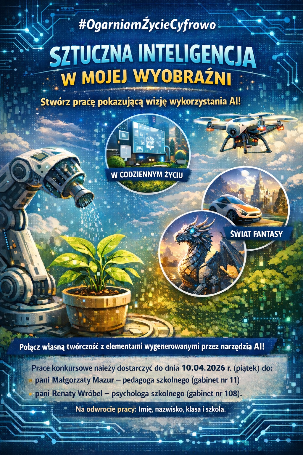 Mamy zaszczyt zaprosić wszystkich chętnych uczniów klas 4-8 oraz nauczycieli do udziału w konkursie „Sztuczna inteligencja w mojej wyobraźni”, organizowanym w ramach projektu #OgarniamŻycieCyfrowo, którego celem jest promowanie bezpiecznego i świadomego korzystania z przestrzeni cyfrowej. Zadaniem uczestników jest przygotowanie pracy przedstawiającej własną wizję wykorzystania sztucznej inteligencji w codziennym życiu, w szkole, w przyszłości świata lub w świecie fantastycznym. Prace powinny odnosić się do rzeczy, roślin itp, nie mogą jednak zawierać wizerunku postaci ludzkich.